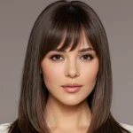 The bangs draw the eye downward, elongating the face. Blow-dry bangs straight and slightly forward using a paddle brush. Suitable for all hair types, particularly effective with straight hair.